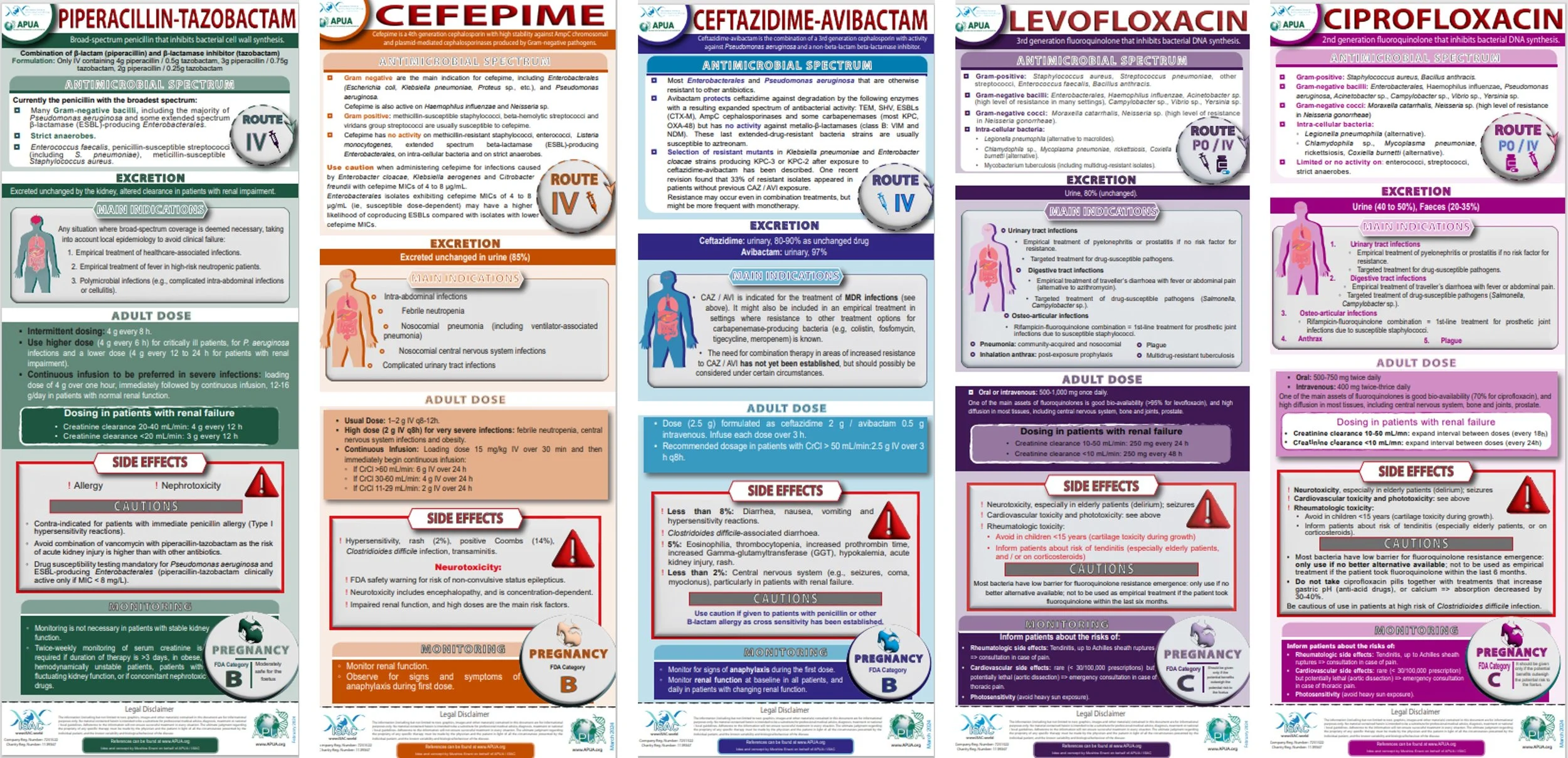 These antibiotic cards have been produced by members of the APUA board, with no support from the pharmaceutical industry, and are available free of charge through our website. They share a common design, with a special focus on their antimicrobial spectrum, main indications, dosing, and adverse events. We hope that you will find them useful and that these antibiotic cards will contribute to better use of antibiotics worldwide, the primary goal of APUA.